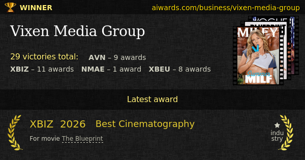 Vixen Media Group is an adult industry company. The company work was rewarded with 29 AVN, XBIZ, NMAE and XBIZ EU prizes in total. Four years in a row the company won XBIZ EU "Global Studio Brand Of The Year". Direct achievements owned by Vixen Media Group include "Best Marketing Campaign - Company Image", "Studio Of The Year" and "Best Production Company".