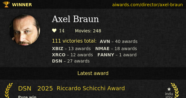 Axel Braun is an award winning adult movies director. Axel Braun was born on September 22. Braun directed over two hundred movies. Different people such as Claudia Ross, Darrell Van Dimes and Mark Logan worked with Braun. Remarkable "Suicide Squad XXX: An Axel Braun Parody", "Star Wars XXX: A Porn Parody" and "24 XXX: An Axel Braun Parody" - were directed by Axel Braun. Such popular studios as Wicked Pictures, Vivid Entertainment Group and Elegant Angel worked with Axel Braun. Braun was inducted into AVN Hall Of Fame in 2011, NMAE Hall Of Fame in 2014 and XRCO Hall Of Fame in 2014. Axel Braun work was rewarded with 111 AVN, XBIZ, NMAE, XRCO, The Fannys and DSN prizes in total. Fans twelve times selected Braun as the winner of several NMAE and The Fannys awards. Braun collected six NMAE "Best Director - Parody" trophies in a row. During 15 years Axel Braun accepted adult awards. Individual trophies owned by Braun include "Director Of The Year - Body Of Work", "Best Feature Director" and "International Executive Of The Year".