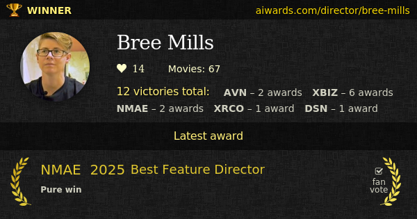 Bree Mills is an adult movies director. Mills directed over sixty movies. Mills worked on such classy titles: "Anne: A Taboo Parody", "Out Of Our System" and "Half His Age: A Teenage Tragedy". Such studios as Pure Taboo, Adult Time and Pulse worked with Mills. Totally 12 AVN, XBIZ, NMAE, XRCO and DSN trophies Mills collected for the entire career. Bree Mills work was rewarded two years in a row with XBIZ "Director Of The Year - Body Of Work". Bree Mills won 10 individual awards including "Best Dramatic Screenplay", "Director Of The Year - Feature Release" and "Director Of The Year - Feature Movie".