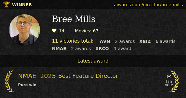 Bree Mills is an adult movies director. Mills directed over sixty movies. Mills worked on such classy titles: "Anne: A Taboo Parody" and "Out Of Our System". Such studios as Pure Taboo, Adult Time and Pulse worked with Mills. Totally 11 AVN, XBIZ, NMAE and XRCO trophies Mills collected for the entire career. Bree Mills work was rewarded two years in a row with XBIZ "Director Of The Year - Body Of Work". Bree Mills won 9 individual awards including "Best Dramatic Screenplay", "Director Of The Year - Feature Release" and "Director Of The Year - Feature Movie".