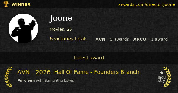 Joone is a prize-winning adult movies director. Joone directed over twenty movies. Awarded "Pirates" and "Pirates II: Stagnetti’s Revenge" - were directed by Joone. Multiple recognized studios including Digital Playground and Adam And Eve invited Joone to work on movies. Joone was inducted into AVN Hall Of Fame in 2026. Joone won totally 6 AVN and XRCO awards. Individual trophies owned by Joone include "Best Director - Video", "Best Director Feature" and "Best Director".