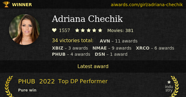 Adriana Chechik is an American prize-winning pornographic performer. On November 4 she was born in Philadelphia, Pennsylvania, US. Currently Adriana Chechik appeared in over three hundred and fifty pornographic film scenes. Among her multiple scene partners were Holly Hendrix, Megan Rain, Arya Fae, Erik Everhard, James Deen and Mick Blue. "Gangbang Me", "Internal Damnation 8" and "TS Playground 21" - these are only few movies where Chechik performed. Miss Chechik shoot scenes with Evil Angel, Hard X and Jonni Darkko Productions. Her rewarded adult perfomances: anal sex, oral sex, virtual-reality and group sex. Chechik was inducted in NMAE Hall Of Fame in 2018. Her work was rewarded with 34 AVN, XBIZ, NMAE, XRCO, Pornhub and DSN awards in total. Fans eight times voted Ms Chechik as the winner of NMAE and Pornhub awards. She won two NMAE "Female Performer Of The Year" awards in a row. Adriana Chechik won highest adult industry trophy, "Performer of the Year", 7 times: AVN-2017, DSN-2016, NMAE-2016, NMAE-2017, NMAE-2019, XRCO-2016, XRCO-2017. Individual awards owned by Ms Adriana Chechik include "Best Body", "Best Adult Star Feature Dancer" and "Best Female Performer".