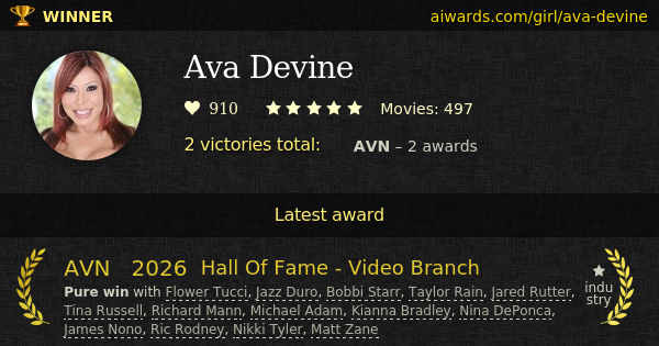 Ava Devine is an American awarded pornstar. She was born on January 22 in Long Island, New York, US. Currently Devine appeared in over 450 pornographic film scenes. She shared scenes with Francesca Le, Arnold Schwartzenpecker, Rod Fontana and Guy DiSilva. Miss Devine shoot with studios JM Productions and Le Wood Productions. Her high-ranked adult perfomance is oral sex. Ava Devine is a member of AVN Hall Of Fame in 2026. Devine gained several trophies including "Best Oral Sex Scene - Video".