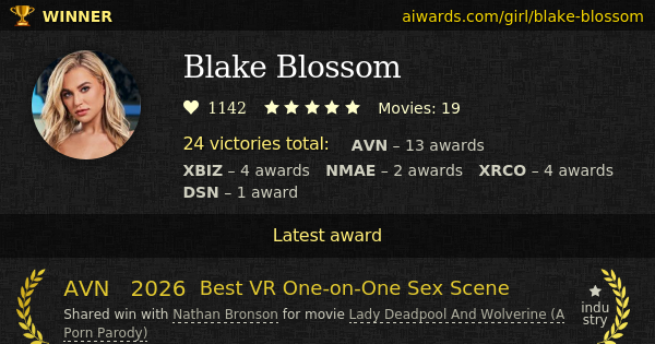 Blake Blossom is a pornographic star. Currently Blake Blossom performed in over ten movies. Among Blossom multiple scene partners were Angel Youngs, Octavia Red, Hailey Rose, John Strong, Ryan Driller and Jax Slayher. Among her roles, Ms Blake Blossom played in popular movies "Dream Slut, Blonde, Stacked, Blake Blossom Worships Jax Slayher's Giant Cock", "An Honest Man" and "Dream Team". Multiple popular studios including SexLikeReal, SLR Originals and Brazzers shoot scenes with Blake Blossom. Ms Blossom has several high-ranked perfomances, including virtual-reality, gonzo, group sex, all-girl and solo. She got totally 24 AVN, XBIZ, NMAE, XRCO and DSN prizes. Blake Blossom won three "Best New Starlet" awards totally. Direct trophies owned by Blake Blossom include "Hottest Newcomer", "Best Actress - Featurette" and "Best Female Performer".