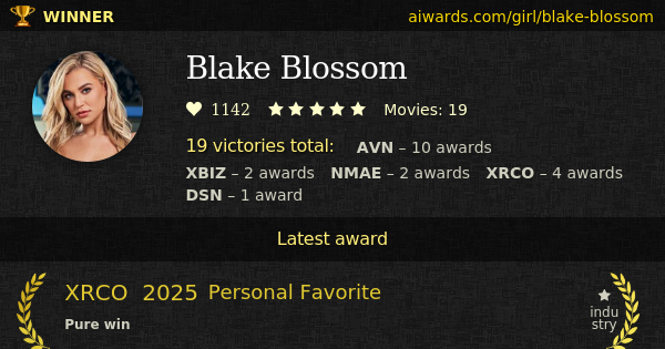 Blake Blossom is a pornographic star. Currently Blake Blossom performed in over ten movies. Among Blossom multiple scene partners were Angel Youngs, Laney Grey, Alexia Anders, John Strong, Ryan Driller and Jax Slayher. Among her roles, Ms Blake Blossom played in popular movies "Dream Slut, Blonde, Stacked, Blake Blossom Worships Jax Slayher's Giant Cock", "An Honest Man" and "Dream Team". Multiple popular studios including SexLikeReal, SLR Originals and Jules Jordan Video shoot scenes with Blake Blossom. Ms Blossom has several high-ranked perfomances, including virtual-reality, gonzo, group sex, all-girl and solo. She got totally 19 AVN, XBIZ, NMAE, XRCO and DSN prizes. Blake Blossom won three "Best New Starlet" awards totally. Direct trophies owned by Blake Blossom include "Hottest Newcomer", "Best Actress - Featurette" and "Best Female Performer".