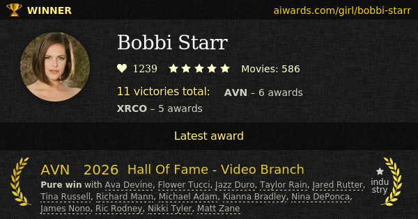 Bobbi Starr is an American pornographic actress. In San Jose, California, US Starr was born on April 6. Currently she starred in over five hundred and fifty movies. A bunch of popular performers, such as Andy San Dimas, Mr. Marcus, Sean Michaels and Erik Everhard, worked with Miss Starr. Some of her famous perfomances are roles in: "Bobbi Starr And Dana DeArmond's Insatiable Voyage", "Belladonna: No Warning 4" and "Double Vision 3". Multiple awarded studios including Jules Jordan Video, Mike John Productions and Evil Angel invited Starr to perform in movies. Bobbi Starr has several admitted perfomances, including double-penetration and POV. Bobbi Starr is a member of AVN Hall Of Fame in 2026. She gained totally 11 AVN and XRCO trophies. Ms Bobbi Starr won XRCO "Superslut" awards two years in a row. She collected "Performer of the Year" within AVN awards in 2012. Miss Starr won direct awards including "Best Porn Star Website ", "Female Performer Of The Year" and "Orgasmic Oralist".