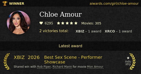 Chloe Amour is an awarded pornstar. Currently Amour appeared in over three hundred movies. She won 1 personal award including "Unsung Siren".