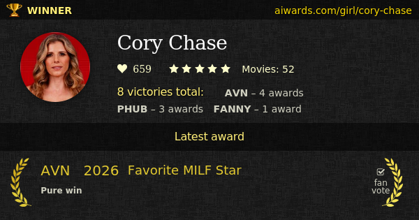 Cory Chase is a pornographic actress and adult model. She was born on February 25. Currently Chase performed in over fifty pornographic film scenes. Fans seven times selected her as the winner of several AVN, Pornhub and The Fannys awards. Cory Chase won AVN "Favorite Indie Clip Star" awards three years in a row. Chase honored with the highest title "Performer of the Year" in 2025 on The Fannys awards. Direct achievements owned by her include "Favorite MILF Star", "Highly Experienced - Top MILF Performer" and "Favorite MILF".
