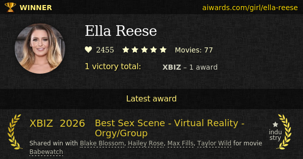 Ella Reese is an adult movies actress. She played in over seventy movies. Among Ella Reese scene partners were Blake Blossom, Hailey Rose, Taylor Wild and Max Fills. She has several recognized perfomances, including group sex and virtual-reality. Reese received first and only prize in 2026 (XBIZ "Best Sex Scene - Virtual Reality - Orgy/Group").