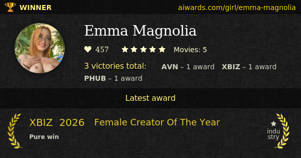 Emma Magnolia is an award winning pornographic performer. Individual awards owned by Magnolia include "Hottest Adult Newcomer", "Female Creator Of The Year" and "Top Lesbian Performer".