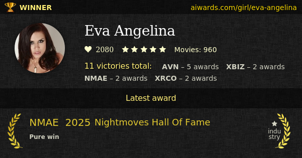 Eva Angelina is an American award winning adult movies actress. Eva Angelina was born on March 14 in Orange County, California, US. She appeared in over nine hundred and fifty pornographic film scenes. Multiple talents including Teagan Presley, Sunny Leone and Alexis Texas worked with Miss Eva Angelina. Angelina made few appearances in such videos as "Upload", "Deviance" and "Car Wash Girls". She shoot with studios Sex Z Pictures, Adam And Eve and SkinworXXX. Ms Angelina has several recognized perfomances, including solo, group sex and all-girl. She is a member of AVN (2018) and NMAE (2025) Hall Of Fame. Totally 11 AVN, XBIZ, NMAE and XRCO trophies Angelina collected for the entire career. All the hard work resulted in XBIZ "Performer of the Year" award in 2008. Personal trophies owned by Angelina include "Best Actress - Video", "Best Tease Performance" and "Female Performer Of The Year".