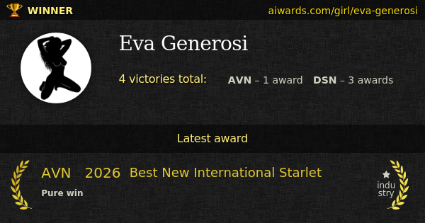 Eva Generosi is a pornographic actress and adult model. Individual trophies owned by her include "Best New International Starlet", "International Female Star Body Of Work" and "Female Star - Body Of Work".