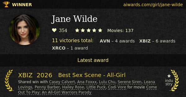 Jane Wilde is an awarded pornographic performer. She was born on September 23. Jane Wilde appeared in over one hundred and thirty movies. Among her multiple scene partners were Codi Vore, Ana Foxxx, Little Puck, Small Hands, Rocco Siffredi and Prince Yahshua. Wilde made few appearances in such videos as "Rocco's Back To America For More Adventures", "Come Out To Play: An All-Girl Warriors Parody" and "3 Cheers For Satan". Multiple recognized studios including Burning Angel Entertainment, Evil Angel and Adult Time invited Wilde to perform in movies. Ms Wilde has several recognized perfomances, including gonzo, anal sex, group sex, threesome and all-girl. Ms Wilde gained totally 11 AVN, XBIZ and XRCO prizes. Miss Jane Wilde won two XBIZ "Best Sex Scene - All-girl" awards in a row. Highest recognition award in adult industry - "Performer of the Year" trophy - was obtained by Miss Jane Wilde in 2023 on XRCO awards. Personal awards owned by her include "Best Acting - Lead" and "Female Performer Of The Year".