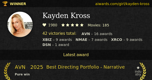 Kayden Kross is an American award winning pornographic actress and director. On September 15 in Sacramento, California, US, Ms Kayden Kross was born. Kross starred in over one hundred and eighty movies. Multiple talents including Riley Steele, Jesse Jane, Katsuni and Manuel Ferrara shot with her. Besides perfomance in awarded titles "Body Heat", "Babysitters 2", "Mothers And Daughters", Kayden Kross directed "Misha Cross Wide Open", "Sacrosanct", "Drive". Multiple studios including Digital Playground, Evil Angel and Manuel Ferrara Productions shoot scenes with her. Ms Kayden Kross has several acknowledged perfomances, including group sex and all-girl. She was inducted in AVN Hall Of Fame and XRCO Hall Of Fame. Kayden Kross work was rewarded with 42 AVN, XBIZ, NMAE, XRCO and DSN awards in total. Fans seven times voted Ms Kross as the winner of AVN and NMAE awards. She won four NMAE "Best Feature Director" awards in a row. Over 13 years Miss Kross name is on the list of winners of adult awards. Kayden Kross collected "Performer of the Year" within NMAE awards in 2010. Individual achievements owned by Ms Kross include "Best Director - Non-Feature", "Director Of The Year - Feature" and "Best Director - web".