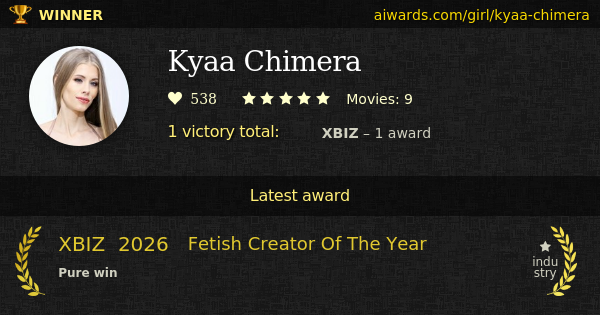 Kyaa Chimera is a pornographic actress. The only award won by Chimera - XBIZ "Fetish Creator Of The Year" in 2026.