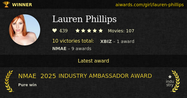 Lauren Phillips is an American award winning pornographic actress and adult model. She was born in Atlantic City, New Jersey, US. Phillips played in over 100 movies. She is a member of NMAE Hall Of Fame. Ms Lauren Phillips gained totally 10 XBIZ and NMAE trophies. All the hard work resulted in XBIZ "Performer of the Year" award in 2024. She collected several individual awards including "MILF Performer Of The Year", "Miss Congeniality" and "Most Underrated Female Performer".