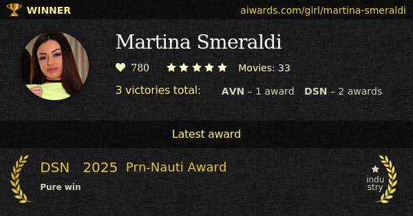 Martina Smeraldi is an award winning pornographic star and adult model. She starred in over thirty movies. Martina Smeraldi had several winning roles which were shared with Sara Bell, Yves Morgan, Oscar Batty and Mike Chapman. Smeraldi shoot with popular studios Evil Angel and Rocco Siffredi Production. Her recognized adult genre is group sex. Individual awards owned by Martina Smeraldi include "Premio Speciale “Prn-Nauti”" and "Prn-Nauti Award".