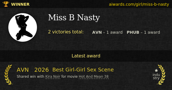 Miss B Nasty is an awarded pornographic star. Multiple recognized studios including Pulse and Brazzers shoot scenes with Miss B Nasty. She has some personal achievements, which include "Top Female Solo Performer".