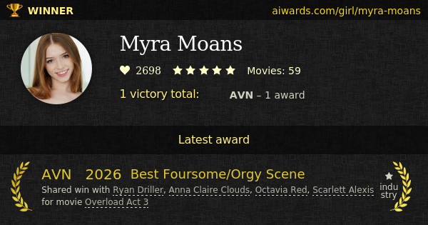Myra Moans is an awarded pornographic star and adult model. Ms Moans performed in over 50 pornographic film scenes. Different stars such as Anna Claire Clouds, Octavia Red, Scarlett Alexis and Ryan Driller worked with Ms Moans. Moans had scenes with such known studios as Parasited and Hentaied.pro Studio. First and only trophy came to her in 2026 - AVN "Best Foursome/Orgy Scene" award.