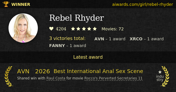Rebel Rhyder is an award winning pornographic star. Currently Miss Rebel Rhyder appeared in over seventy movies. Rebel Rhyder top-ranked adult genre is anal sex. Individual awards owned by Rhyder include "Superslut" and "Most Heroic Ass - Best Anal".