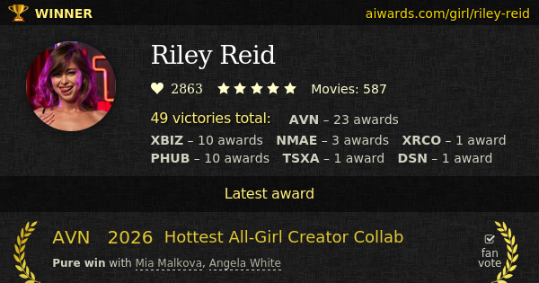 Riley Reid is an American prize-winning adult movies actress. On July 9 Riley Reid was born in Miami, Florida, US. Miss Reid starred in over 550 movies. Among Riley Reid scene partners were Remy LaCroix, Romi Rain, Aidra Fox, Mick Blue, Mandingo and Manuel Ferrara. Some of Miss Reid famous perfomances are roles in: "Being Riley", "I Am Riley" and "Mandingo Massacre 6". Multiple recognized studios including Jules Jordan Video, New Sensations and Tushy shoot scenes with her. Miss Reid admitted adult perfomances: threesome, all-girl, parody, anal sex, double-penetration, virtual-reality, group sex and oral sex. Reid was inducted in AVN and XRCO Hall Of Fame. Riley Reid got 49 AVN, XBIZ, NMAE, XRCO, Pornhub, TSXA and DSN trophies in total. Ms Riley Reid was thirteen times fan-voted (AVN, NMAE, Pornhub and TSXA). Reid got four AVN "Social Media Star" awards in a row. Over 12 years Ms Riley Reid kept winning awards. All the hard work resulted in 3 "Performer of the Year" awards (AVN-2016, DSN-2017, XBIZ-2014). Direct awards owned by Miss Riley Reid include "Female Performer Of The Year", "Most Popular Female Performer" and "Top Lesbian Performer".