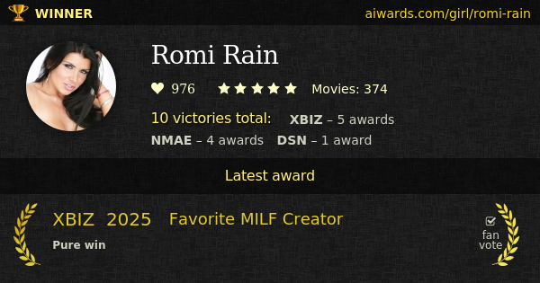 Romi Rain is an American pornographic star and adult model. On January 12 Miss Rain was born in Boston, Massachusetts, US. Currently she starred in over three hundred and fifty movies. Riley Reid, Blake Blossom, Nicole Aniston, Xander Corvus, Small Hands and Ryan Driller shared scenes with Miss Romi Rain. "My Sinful Life", "Metal Massage" and "Palm Royale" - this is only a small list of movies where Romi Rain performed. She worked for recognized studios DreamZone Entertainment, Burning Angel Entertainment and VR Bangers. Among Miss Romi Rain perfomances in adult insudtry, virtual-reality is the top-ranked one. She got 10 XBIZ, NMAE and DSN prizes in total. Highest recognition award in adult industry - "Performer of the Year" trophy - was obtained by Romi Rain 2 times (DSN-2018, XBIZ-2018). Romi Rain has some individual achievements, which include "Female Performer Of The Year", "Favorite MILF Creator" and "Best Ink".