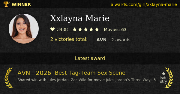 Xxlayna Marie is an awarded pornographic actress. She appeared in over 60 pornographic film scenes. Marie starred in scenes with Zac Wild, Vince Karter and Jules Jordan. Ms Xxlayna Marie made few appearances in such titles as "It's Double Trouble For Xxlayna Marie" and "Jules Jordan’s Three Ways 3". Two years in a row she won AVN "Best Tag-team Sex Scene".