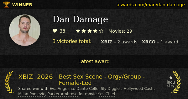 Shared win with Vicki Chase, Alex Jones, Richard Mann for web-scene Mouths Of Babes: Vicki Chase, Dan Damage, Alex Jones And Richard Mann released in Up To And Including Her Limits 3