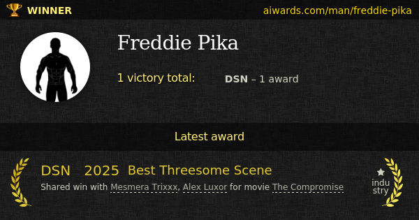 Freddie Pika is an awarded adult movies actor. First and only prize came to Mr Pika in 2025 - DSN "Best Threesome Scene" trophy.