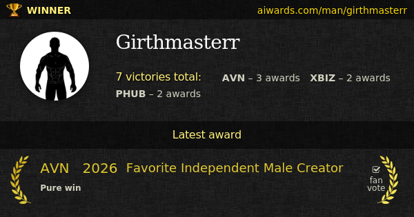 Girthmasterr is a prize-winning pornographic actor. He was four times fan-voted (AVN and Pornhub). Two years in a row Girthmasterr won AVN "Favorite Independent Male Creator". His personal achievements include "Hottest Boy/Girl Creator Collab", "Male Creator Of The Year" and "Top Big Dick Performer".