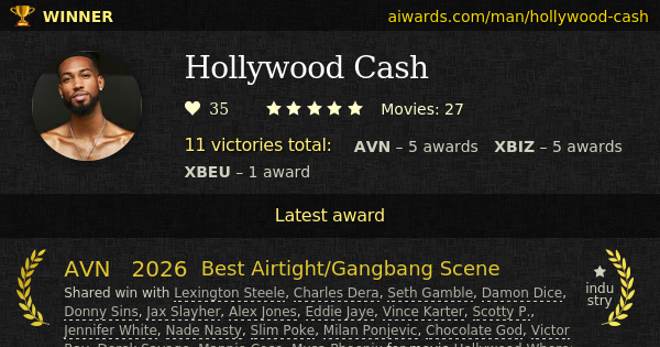 Shared win with Lexington Steele, Charles Dera, Seth Gamble, Damon Dice, Donny Sins, Jax Slayher, Alex Jones, Eddie Jaye, Vince Karter, Scotty P., Jennifer White, Nade Nasty, Slim Poke, Milan Ponjevic, Chocolate God, Victor Ray, Derek Savage, Mannie Coco, Musa Phoenix for movie Hollywood Whore: A Jennifer White Showcase Film