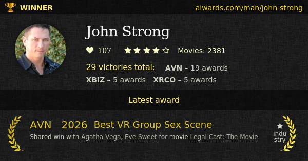 John Strong is a multiple award winning pornographic actor. Mr Strong was born on April 9. Currently Strong starred in over two thousand and three hundred movies. John Strong worked with known performers Angela White, Kristi Myst, Adriana Chechik, Mick Blue, Erik Everhard and Jon Jon. Strong made few appearances in such remarkable videos as "In The Days Of Whore", "Gangbang Me" and "Anna Claire Clouds: Dark Side". Strong had scenes with such studios as SexLikeReal, Hard X and Evil Angel. John Strong is an inductee of the AVN and XRCO Hall Of Fame. Totally 29 AVN, XBIZ and XRCO prizes he won for the entire career. Strong won three AVN "Best Gangbang Scene" awards in a row. John Strong collected awards in over 14 years range. He has some personal achievements, which include "Unsung Swordsman".