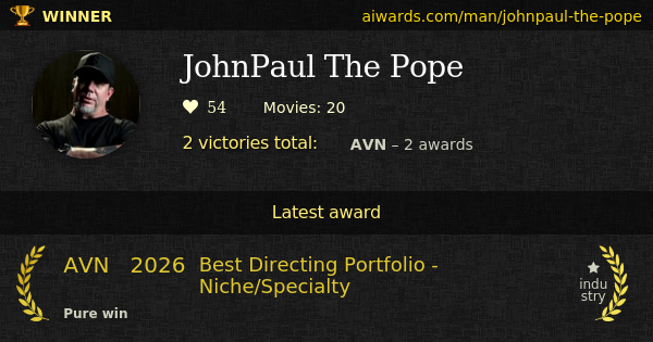 JohnPaul The Pope is an award winning pornographic male performer. He appeared in over twenty movies. He was inducted into AVN Hall Of Fame (2023). Personal awards owned by Mr JohnPaul The Pope include "Best Directing Portfolio - Niche/Specialty".