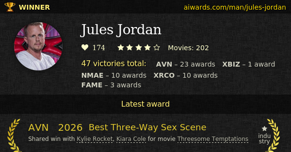 Jules Jordan is a pornographic actor and award-winning director. On May 25 he was born. Currently Jordan shot in over two hundred movies. Jessica Darlin, Asa Akira, Kennedy Leigh, Brian Pumper, Criss Strokes and Markus Dupree shared scenes with Jules Jordan. Mr Jordan directed movies "Lex The Impaler 3", "Lex The Impaler 4", "Lex The Impaler 5" and starred in "Weapons Of Ass Destruction 2", "Asa Akira To The Limit", "Ultimate Fuck Toy: Kennedy Leigh". For numerous achievements Jules Jordan was inducted into AVN Hall Of Fame in 2011 and XRCO Hall Of Fame in 2009. Jordan got 47 AVN, XBIZ, NMAE, XRCO and F.A.M.E. trophies in total. Mr Jordan won eleven fan prizes (NMAE and F.A.M.E.). Jules Jordan won AVN "Best Director - Ethnic Video" awards three years in a row. Over 22 years Jordan name is on the list of winners of adult awards. Jordan won 36 personal awards including "Director Of The Year - Body Of Work", "Best Director - Non-Feature" and "Best Director - Gonzo/Anthology Production".