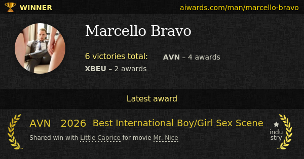 Marcello Bravo is an awarded pornographic male performer. Among Bravo multiple scene collegues were Little Caprice, Rika Fane, Catherine Knight, Stanley Johnson and Matthew Meier. Awarded "Anal Beauty 10", "Newly Engaged Swingers" and "Buttmuse Anal Divas" - this is only a small list of titles where Bravo performed. Multiple popular studios including Little Caprice Dreams, WeCumToYou and Tushy invited him to perform in movies. Bravo won "Performer of the Year" within AVN awards in 2026. Personal awards owned by Marcello Bravo include "International Male Performer Of The Year".