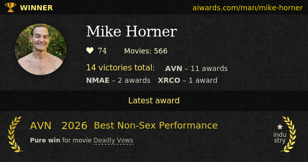 Mike Horner is a prize-winning pornographic male performer. Horner appeared in over five hundred and fifty movies. He made few appearances in such popular videos as "Nothing To Hide 2", "Euphoria" and "Wild Thing". Multiple studios including Wicked Pictures, Cal Vista and Metro shoot scenes with Horner. Mike Horner was inducted into XRCO Hall Of Fame in 1992. Mike Horner got 14 AVN, NMAE and XRCO awards in total. Mr Horner got two AVN "Best Actor - Film" awards in a row. Personal trophies owned by Mr Horner include "Best Supporting Actor - Video", "Best Actor - Video" and "Best Non-Sex Performance".