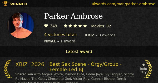 Shared win with Angela White, Damon Dice, Eddie Jaye, Sly Diggler, Scotty P., Mazee The Goat, Chocolate God, Victor Ray, Gunnar Bishop, Derek Savage for movie Pizza Party Blowbang