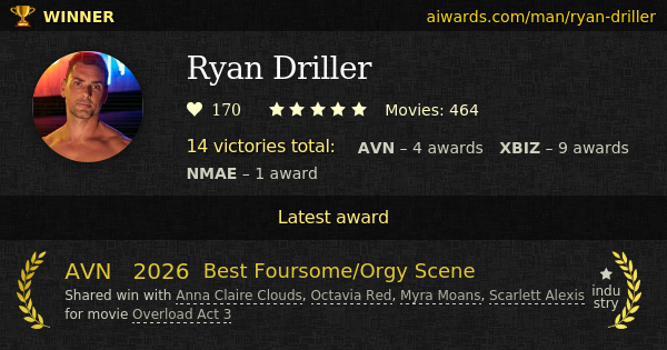 Ryan Driller is an American awarded adult movies actor. In Denver, Colorado, US on August 17 Driller was born. Ryan Driller starred in over four hundred and fifty movies. Among his multiple scene collegues were India Summer, Blake Blossom, Angela White, Kendall Karson, Michael Vegas and Mick Blue. Popular "Man Of Steel XXX: An Axel Braun Parody", "Marriage 2.0" and "Wonder Woman XXX: An Axel Braun Parody" - this is only a small list of titles where Mr Driller performed. Multiple popular studios including Vivid Entertainment Group, Wicked Pictures and VR Bangers shoot scenes with Ryan Driller. Totally 14 AVN, XBIZ and NMAE awards he won for the entire career. Ryan Driller won XBIZ "Best Sex Scene - Virtual Reality" awards two years in a row. Highest recognition award in adult industry - "Performer of the Year" trophy - was obtained by his 2 times (NMAE-2015, XBIZ-2016). Personal awards owned by Mr Ryan Driller include "Male Performer Of The Year".