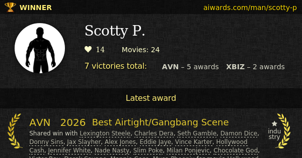 Shared win with Angela White, Michael Vegas, Robby Echo, Alex Mack, Jack Blaque, Andrew Light, Anthony Pierce, Apollo Banks, Celtic Iron, Christopher Mac, Cody Breeze, Cole Church, James Sinner, Johnny Goodluck, Joshua Lewis for web-scene Sexually Rated Programming - Blowbang: Angela White, Alex Mack, Andrew Light, Anthony Pierce, Apollo Banks, Celtic Iron, Christopher Mac, Cody Breeze, Cole Church, Jack Blaque, James Sinner, Johnny Goodluck, Joshua Lewis, Michael Vegas, Robby Echo, Scotty released in Pornstar Therapy 7