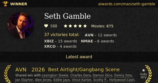 Seth Gamble is an awarded pornographic actor and director. He was born on February 10. Gamble appeared in over eight hundred and fifty pornographic film scenes. Different stars such as Jennifer White, India Summer, Angela White, Vince Karter, Eric Masterson and Scotty P. worked with him. Some of Seth Gamble famous perfomances are roles in: "Perspective", "A Killer On The Loose" and "Deadpool XXX: An Axel Braun Parody". Multiple popular studios including Pulse, Wicked Pictures and Adult Time shoot scenes with Seth Gamble. Mr Gamble won totally 37 AVN, XBIZ, NMAE and XRCO trophies. Five times Gamble was voted by fans for the win (NMAE). Mr Gamble won two AVN "Best Leading Actor" awards in a row. During 11 years Gamble accepted adult industry awards. Seth Gamble won highest adult industry trophy, "Performer of the Year", 6 times: AVN-2023, NMAE-2016, XBIZ-2020, XBIZ-2023, XBIZ-2024, XRCO-2025. Gamble individual achievements include "Best Male Newcomer", "Best Actor - Feature" and "Male Performer Of The Year".