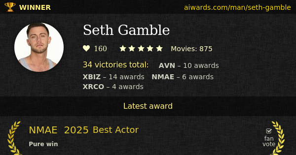 Seth Gamble is an awarded pornographic actor and director. He was born on February 10. Gamble appeared in over eight hundred and fifty pornographic film scenes. Different stars such as India Summer, Angela White, Britney Amber, Eric Masterson, Ryan Driller and Codey Steele worked with him. Some of Seth Gamble famous perfomances are roles in: "Perspective", "A Killer On The Loose" and "Deadpool XXX: An Axel Braun Parody". Multiple popular studios including Pulse, Wicked Pictures and Adult Time shoot scenes with Seth Gamble. Mr Gamble won totally 34 AVN, XBIZ, NMAE and XRCO trophies. Five times Gamble was voted by fans for the win (NMAE). Mr Gamble won two AVN "Best Leading Actor" awards in a row. During 10 years Gamble accepted adult industry awards. Seth Gamble won highest adult industry trophy, "Performer of the Year", 6 times: AVN-2023, NMAE-2016, XBIZ-2020, XBIZ-2023, XBIZ-2024, XRCO-2025. Gamble individual achievements include "Best Male Newcomer", "Best Actor - Feature" and "Male Performer Of The Year".