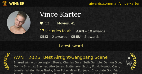 Vince Karter is an awarded pornographic actor. Currently he starred in over forty movies. Karter had several winning roles which were shared with Anna Claire Clouds, Jennifer White, Nicole Pearl, Damon Dice, Jax Slayher and Chocolate God. Splendid "Hollywood Whore: A Jennifer White Showcase Film", "Anna Claire Clouds: Dark Side" and "Jacky" - these are only few titles where Vince Karter performed. He shoot scenes with Jules Jordan Video, Evil Angel and Elegant Angel. Totally 17 AVN, XBIZ and XBIZ EU trophies Karter won for the entire career. He got two AVN "Best International Anal Sex Scene" awards in a row. All the hard work resulted in 6 "Performer of the Year" awards (AVN-2024, AVN-2025, AVN-2026, XBIZ EU-2020, XBIZ EU-2022, XBIZ-2026). Personal trophies owned by Vince Karter include "International Male Performer Of The Year" and "Male Performer Of The Year".