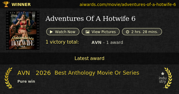 "Adventures Of A Hotwife 6" is a 2025 award winning pornographic film made by New Sensations and directed by Paul Woodcrest. Total length: 2 hrs. 28 mins.; sex scenes count: 4. Performers such as Gal Ritchie, Milan Ponjevic, Lovely Lo, Will Pounder and Scarlette Moon performed in the release. Scenes from the movie are in genre: gonzo and POV. The only prize won by "Adventures Of A Hotwife 6" is AVN "Best Anthology Movie Or Series" (2026).