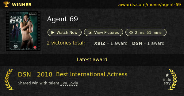 "Agent 69" is a 2017 XXX film created by Adam & Eve and directed by Jay Allan. Film consists of 4 scenes with total length of 2 hrs. 51 mins. Several popular performers shot in the movie: Eva Lovia, Mick Blue, Alex Harper, Honey Gold and Elsa Jean. This film achievements include "Best Music" and "Best International Actress".