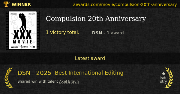 "Compulsion 20th Anniversary" is an award winning pornographic film produced by Elegant Angel in 2024. First and only award came to the film in 2025 - DSN "Best International Editing" trophy.