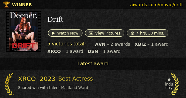 "Drift" is a 2022 award winning XXX film created by Deeper and directed by Kayden Kross. Movie length: 4 hrs. 30 mins.; sex episodes count: 5. Anal sex, double-penetration and group sex - release acknowledged adult themes. Scene from "Drift" starring Mick Blue, Seth Gamble and Maitland Ward was honored with XBIZ "Best Sex Scene - Feature Movie" award. Kayden Kross took "Outstanding Directing - Individual Work" (AVN) prize for this film. Several awards owned by the movie: "Best Leading Actress", "Outstanding Directing - Individual Work" and "Best Sex Scene - Feature Movie".