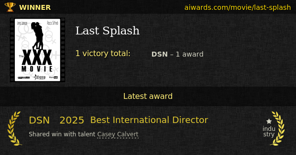 "Last Splash" is a 2024 awarded pornographic movie produced by Lust Cinema and directed by Casey Calvert. Director Casey Calvert won trophy for the direction of this movie. The first and only award gained by the movie is 2025 DSN "Best International Director".