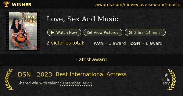 "Love, Sex And Music" is a 2022 pornographic flick created by Adam & Eve. Total length: 2 hrs. 14 mins.; scenes count: 7. Several marvelous performers appeared in the release: September Reign, Samantha Lexi, Whitney Wright and Vanna Bardot. "Love, Sex And Music" achievements include "Best Non-Sex Performance" and "Best International Actress".