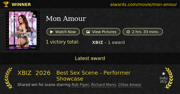 "Mon Amour" is a 2025 awarded porno movie created by Evil Angel and directed by Jonni Darkko. Total length: 2 hrs. 33 mins.; scenes count: 4. This release contains such recognized adult themes as anal sex, double-penetration, gonzo and group sex. Sex action with Rob Piper, Richard Mann and Chloe Amour was rewarded with XBIZ "Best Sex Scene - Performer Showcase" achievement.