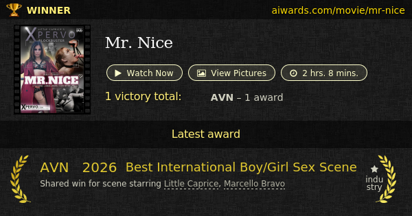 "Mr. Nice" is an award winning porn flick directed by Marcello Bravo in 2025 and created by Little Caprice. Movie is separated into 3 sex episodes, with total length of 2 hrs. 8 mins. The movie contains scenes with such theme as oral sex. Episode starring Little Caprice and Marcello Bravo won AVN "Best International Boy/Girl Sex Scene" award.